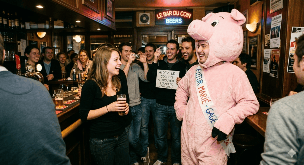 En fait, on va littéralement déguiser notre futur marié en cochon. Oui mais pas seulement, puisque son gage va être de tenter de se faire draguer dans un bar (ou un tout autre lieu, c’est vous qui voyez). Si personne ne l’aborde, faites-le aller vers les gens… C’est quand même son enterrement de vie de garçon !